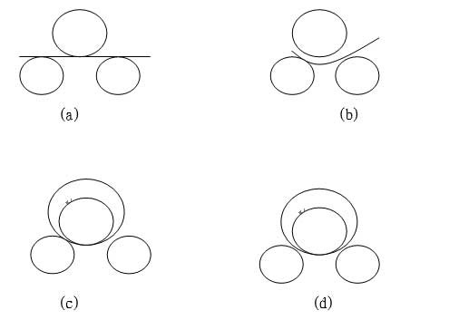 該機(jī)結(jié)構(gòu)形式為三輥對(duì)稱式。上輥在兩下輥中間對(duì)稱位置作垂直升降運(yùn)動(dòng),通過(guò)蝸輪、蝸桿而獲得,兩下輥?zhàn)餍D(zhuǎn)運(yùn)動(dòng),通過(guò)減速機(jī)的輸出齒輪與下輥齒輪嚙合,實(shí)現(xiàn)板材的行走。當(dāng)上輥的下壓力超過(guò)材料的屈服限度時(shí),便使所卷制的材料變形,變形過(guò)程如下圖: