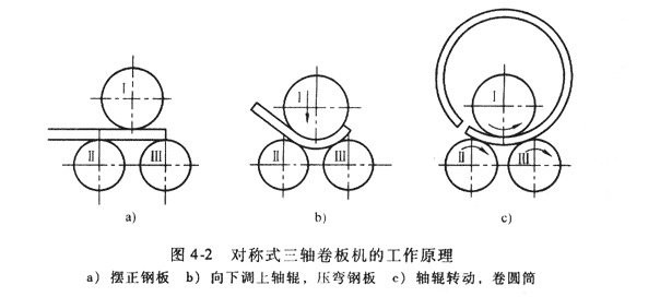 該機(jī)結(jié)構(gòu)型式為三輥對(duì)稱式,上輥在兩下輥中間對(duì)稱位置作垂直升降運(yùn)動(dòng),通過(guò)絲桿絲母蝸桿傳動(dòng)而獲得,兩下輥?zhàn)餍D(zhuǎn)運(yùn)動(dòng),通過(guò)減速機(jī)的輸出齒輪與下輥齒輪嚙合,為卷制板材提供扭矩。